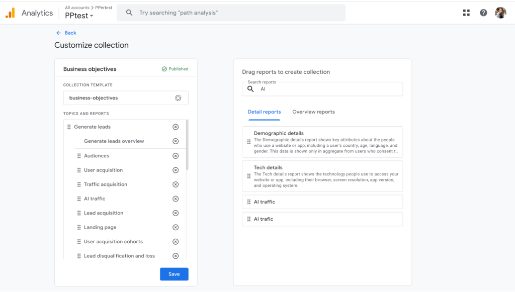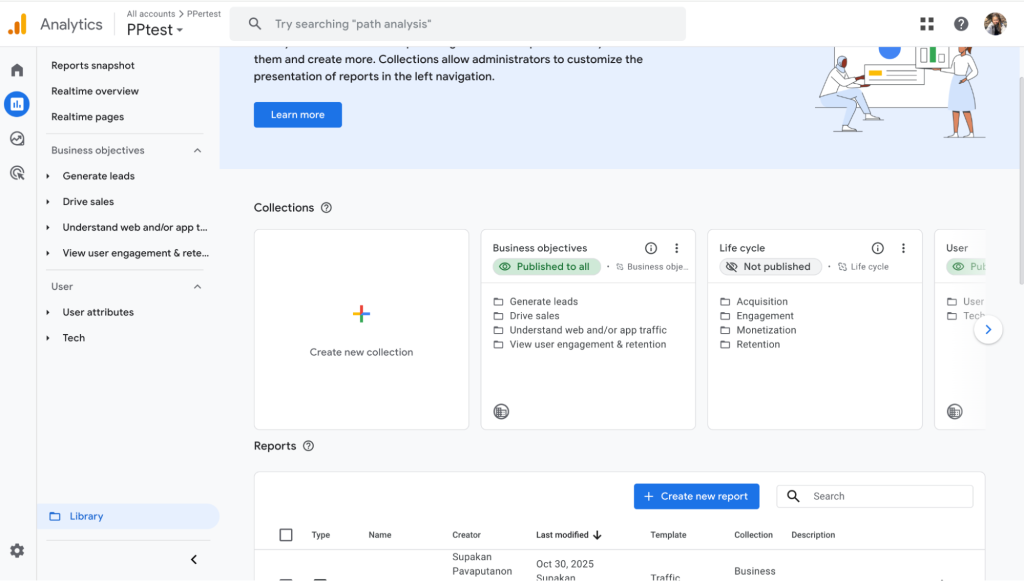 6. กลับมาที่หน้า Library → เลือก Business objectives ค้นหาชื่อ Report ที่กด Save ไว้ → ลากไปที่ช่อง Topics and Reports → คลิก Save