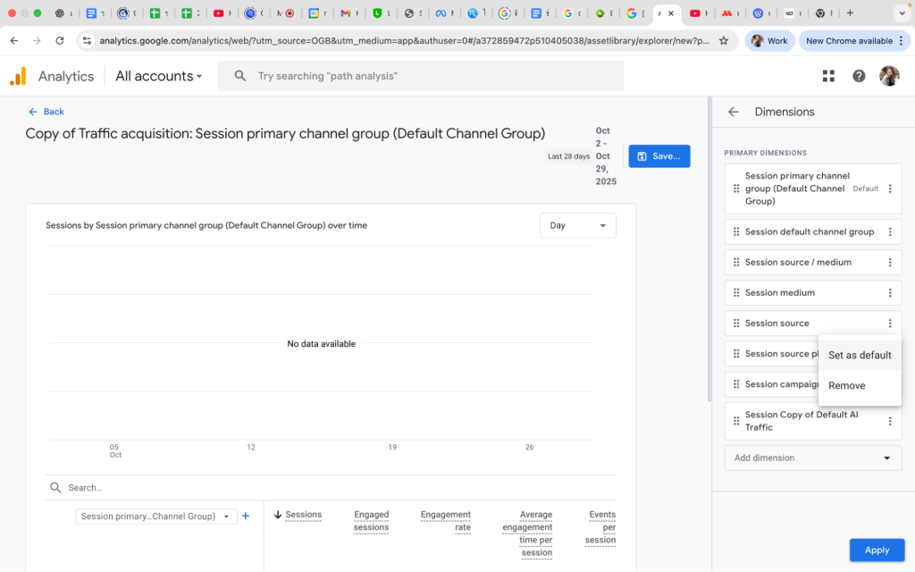 4. ใน Dimensions เลือก “Session source” แล้วตั้งให้เป็น Default