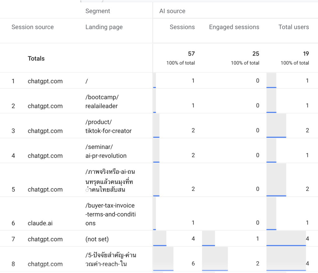 ซึ่งเครื่องมือที่ใช้ทำได้ง่ายและแม่นยำที่สุดในตอนนี้ก็คือ Google Analytics 4 (GA4) เราสามารถเช็ค “AI Traffic” เพื่อดูว่า AI ตัวใดส่งผู้ใช้เข้ามาบ้าง ChatGPT, Gemini, Claude หรือ Copilot และพาผู้ใช้เข้าไปยังหน้าไหนของเว็บบ้าง